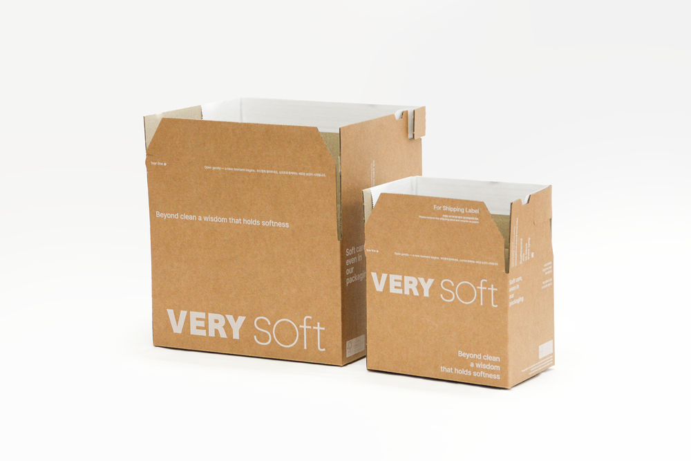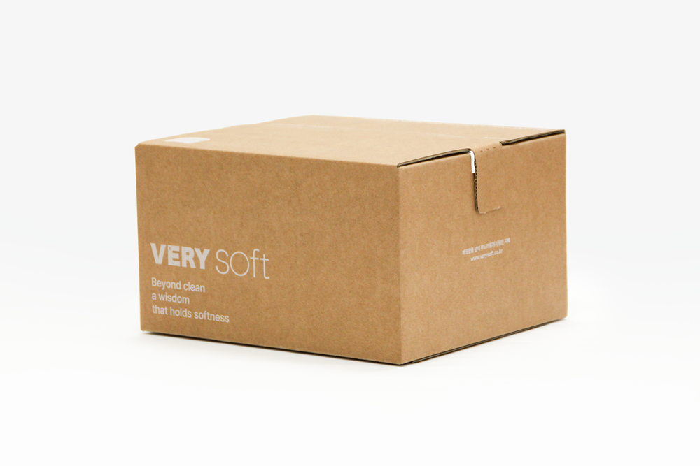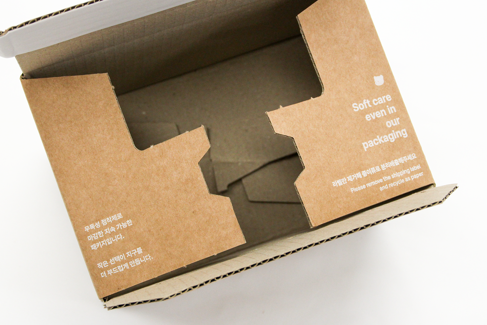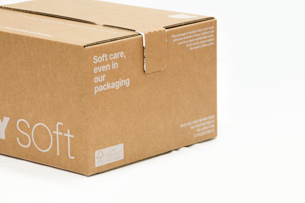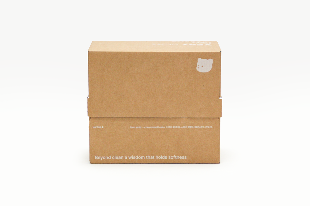 브랜드가 추구하는 깨끗함과 부드러움을 크라프트 재질과 화이트 1도 인쇄, 테이프리스 구조 안에 담았습니다.