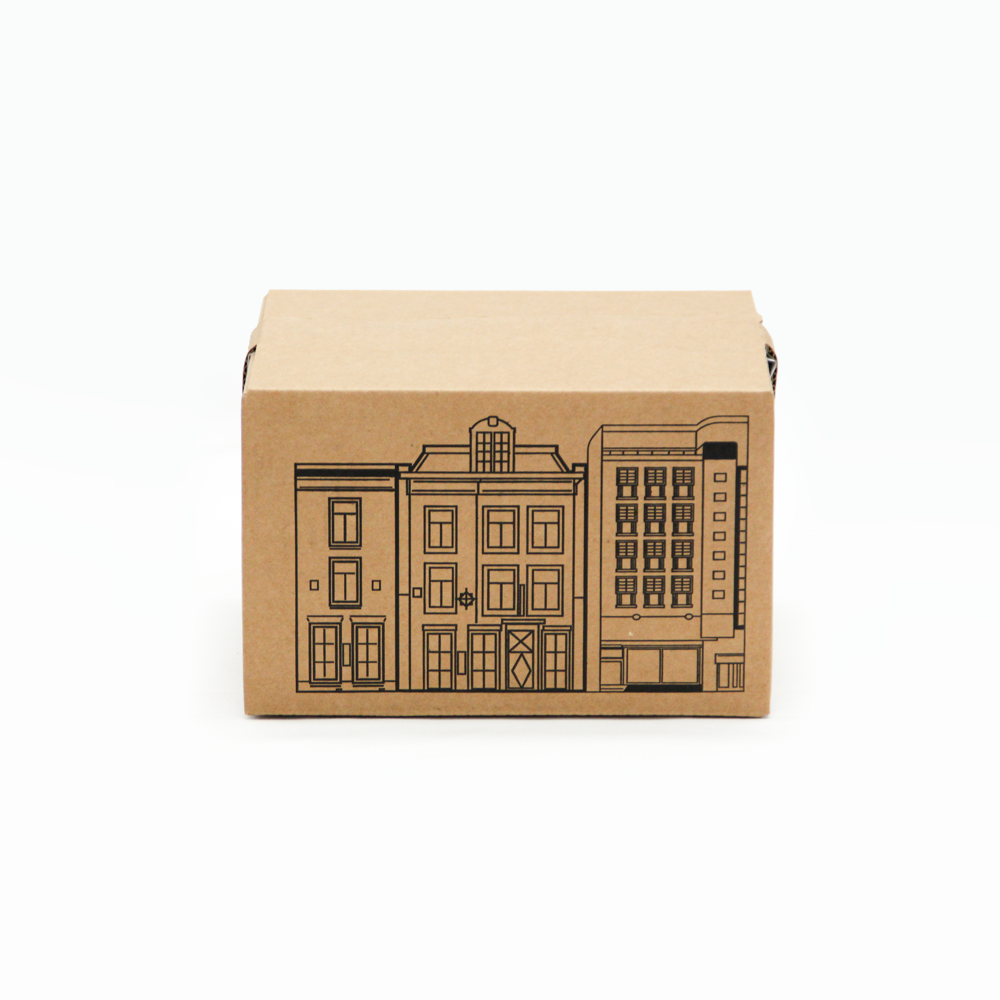 단색 인쇄지만 건물의 창, 문, 층고를 섬세하게 살려 브랜드의 클래식한 분위기가 잘 드러나도록 했습니다.