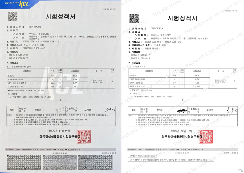 2025년 10월 22일 KCL 시험 결과 리펄프테이프 80gsm(고중량)은 아래 수치를 기록했습니다.