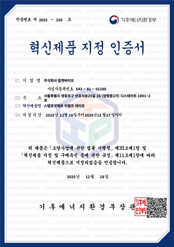 리펄프테이프가 조달청 혁신제품으로 지정되어 공공부문으로도 활용 범위를 넓혀가고 있습니다.